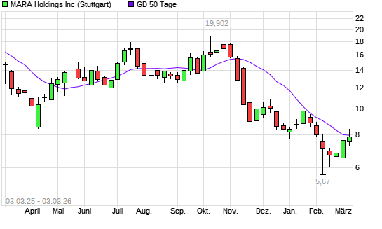 Mit dem Anstieg auf 8,14 EUR hat die MARA Holdings-Aktie am 02.03.2026 die 50-Tage-Linie nach oben gekreuzt.