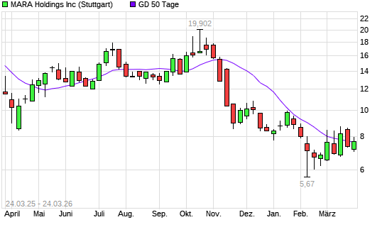 Mit dem Anstieg auf 7,66 EUR hat die MARA Holdings-Aktie am 23.03.2026 die 50-Tage-Linie nach oben gekreuzt.