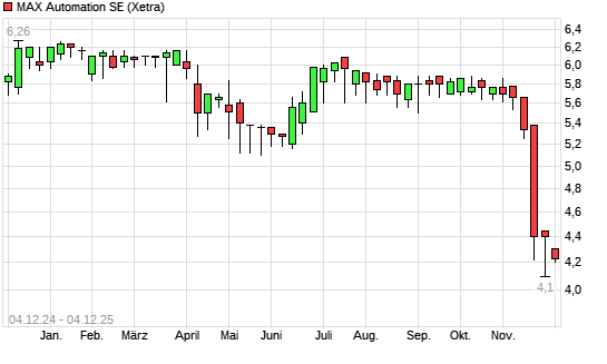 Mit dem Rücksetzer auf 4,05 EUR hat die MAX Automation-Aktie (ISIN DE000A2DA588) am 03.12.2025 ein neues 3-Jahres-Tief erreicht und damit den Kurs vom 25.11.2025 eingestellt.