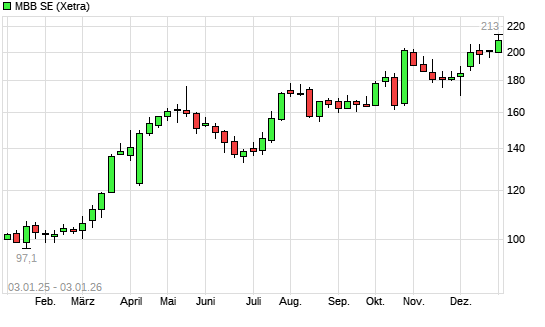 Mit dem Anstieg auf 210,00 EUR hat die MBB-Aktie (ISIN DE000A0ETBQ4) am 02.01.2026 ein neues All-Time-High erreicht und damit den Kurs vom 29.12.2025 eingestellt.