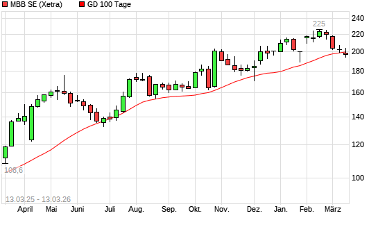 Mit dem Rücksetzer auf 199,80 EUR hat die MBB-Aktie am 12.03.2026 die 100-Tage-Linie nach unten gekreuzt.