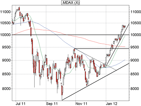 Rosenheim (DAX-Premium-Trader) - Der MDAX hat bereits 77% des Sommer-Crashs aufgeholt und sich fast bis zum Ausgangsniveau der EU-Schuldenkrise zurückgeschoben. Dabei sattelte das Nebenwerte-Barometer allein im noch jungen Jahr 2012 stolze 1.516 Punkte bzw. 17% auf, womit die wichtige Marke von 10.000 Punkten regelrecht überrannt wurde. Der Blick in die nicht allzu ferne Vergangenheit zeigt jedoch, dass es nun deutlich schwieriger werden dürfte, an den Aufwärtstrend anzuknüpfen. Im Detail: