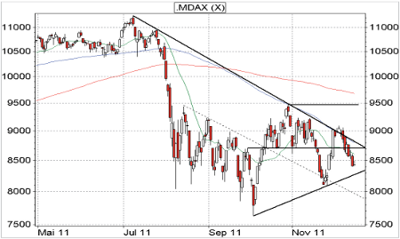 In den vergangen 92 Sitzungen fiel der 50 Werte umfassende Index bereits dreimal im September, Oktober sowie November per Tagesschlusskurs zurück. Gerade im zyklisch positiven Dezember sollten daher neue Abwärtssignale unbedingt durch einen Wochenschlusskurs unterhalb des 8.300er-Haltebereichs bestätigt werden. Kommt es tatsächlich zu diesem Verlauf droht anschließend ein weiterer Kurssturz. Darunter müsste aus technischer Perspektive sogar mit einer Fortsetzung der Abwärtsbewegung bis zur August-Abwärtstrendgeraden gerechnet werden. Deutlich aufhellen würde sich das Chartbild nun wieder oberhalb von 8.700 Punkten. Denn sobald an diesem Widerstand der Break gelingt, besteht sofort weiteres Aufwärtspotenzial.