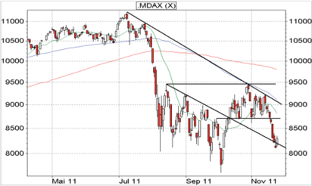 13 Mal hatte der MDAX bislang in seiner Historie einen Abschlag von mehr als fünf Prozent innerhalb von fünf Handelstagen vorzuweisen, wobei gleichzeitig, wie gestern, der Tagesschlusskurs auch das Zwischentief darstellte. Aus charttechnischer Sicht keine exzellenten Voraussetzungen für eine kurzfristige Trendumkehr, denn die Wahrscheinlichkeit, dass sich die Kurse in weiteren fünf Handelstagen auf einem höheren Niveau befinden liegt gerade einmal bei 38%. Dementsprechend sollte also eher von einem erneuten Rücksetzer ausgegangen werden, in dem die aktuellen Tiefststände erneut unterboten werden. Unterhalb der August-Abwärtstrendgeraden gelten weitere Verkaufssignale, die übergeordnet einen Absturz bis in den Bereich der aktuellen Jahresstiefs nach sich ziehen könnten. Zu beachten ist dabei, dass demgegenüber die Jahreszeit auch im MDAX für steigende Kurse spricht, zumal der Nebenwerte-Index in seiner gesamten Geschichte noch nie im Dezember auf ein neues Jahrestief weggebrochen ist.