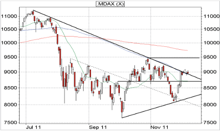 Rosenheim (DAX-Premium-Trader) - Die Ende November gestartete Aufwärtsbewegung hat in den ersten Dezember-Handelstagen wieder deutlich an Dynamik verloren. Übergeordnet entfalten dabei vor allem die Marke von 9.000 Punkten, an denen der MDAX bereits im Oktober gescheitert war, eine erhebliche Bremskraft. Damit wird es nun richtig spannend, denn obwohl sich das charttechnische Bild in den vergangenen Sitzungen deutlich aufgehellt hat, ist das Rückschlagspotenzial augenblicklich nicht zu unterschätzen. Die entscheidenden Schwellen im Detail: