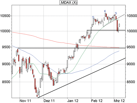 Während sich das deutsche Leitbarometer am 29. Februar noch einmal auf das Niveau des gültigen Jahreshochs schieben konnte, blieb das Nebenwerte-Barometer mit Notierungen im Bereich von 10.547 unter den Jahres-Tops zurück. Durch die Unterkreuzung des 10.200er-Haltebereichs auf Schlusskursbasis wurde daher nun eine Schulter-Kopf-Schulter-Formation herausgebildet. Dieses Muster deutet in der technischen Lehre auf eine Trendwende und den Beginn einer größeren Korrektur hin. Sofern die Kurse in den kommenden Sitzungen nicht über 10.550 Zähler ansteigen, behält die Umkehrformation ihre Wirkung. Unterhalb von 10.000 Punkten dürfte sich der Abwärtsdruck aus technischer Sicht sofort wieder verstärken, sodass im März Ziele im Bereich von 9.800 oder sogar auf dem Niveau der 200-Tage-Linie bei 9.484 Punkten angesteuert werden könnten.