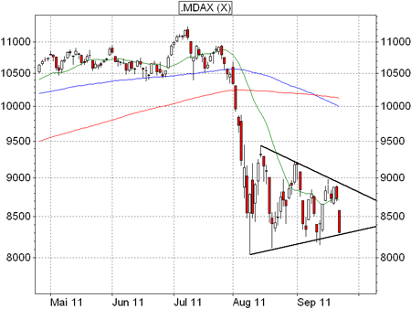 Rosenheim (DAX-Premium-Trader) - Das deutsche Nebenwerte-Barometer ist in den vergangenen Sitzungen in die Spitze einer Dreiecksformation hineingelaufen. Während es dabei am Freitag so aussah, als könnte der Ausbruch nach oben gelingen, haben die Kurse jetzt schlagartig die Richtung geändert. Damit steht der MDAX nun kurz davor, neue Verkaufssignale zu generieren und den nächsten Abschnitt des Bärenmarktes einzuleiten. Im Detail: