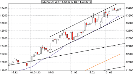 Rosenheim (DAX-Premium-Trader) - Rund 1% legte auch der MDax im Vergleich zur vorige Woche zu. Zur Vorsicht mahnt hingegen die innere Stärke – angezeigt durch mein Trendbarometer. Ganze fünf Prozentpunkte auf jetzt 83% sackte diese, trotz insgesamt festerer Notierungen, ab.