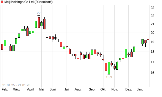 Mit dem Anstieg auf 19,70 EUR hat die MEIJI Holdings Co-Aktie (ISIN JP3918000005) am 20.01.2026 ein neues 6-Monats-Hoch erreicht und damit den Kurs vom 09.01.2026 eingestellt.
