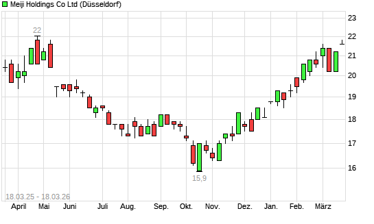 Mit dem Anstieg auf 22,00 EUR hat die MEIJI Holdings Co-Aktie (ISIN JP3918000005) am 17.03.2026 ein neues 6-Monats-Hoch erreicht und damit den Kurs vom 16.03.2026 eingestellt.