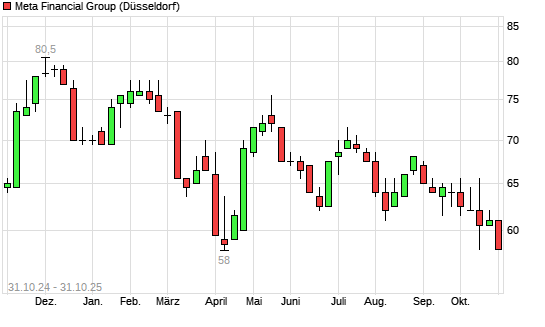 Mit dem Rücksetzer auf 58,50 EUR hat die META FINANCIAL GROUP-Aktie (ISIN US59100U1088) am 30.10.2025 ein neues 12-Monats-Tief erreicht und damit den Kurs vom 07.04.2025 eingestellt.