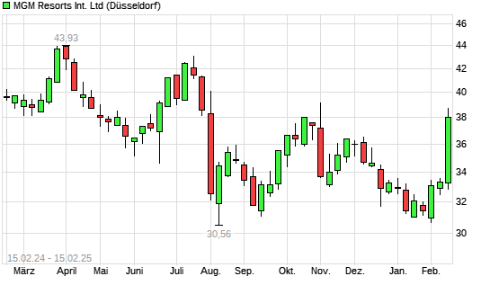 Mit dem Anstieg auf 38,77 EUR hat die MGM Resorts International-Aktie (ISIN US5529531015) am 14.02.2025 ein neues 6-Monats-Hoch erreicht und damit den Kurs vom 29.10.2024 eingestellt.