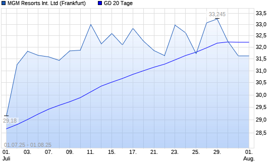 Mit dem Rücksetzer auf 31,63 EUR hat die MGM Resorts International-Aktie am 31.07.2025 die 20-Tage-Linie nach unten gekreuzt.