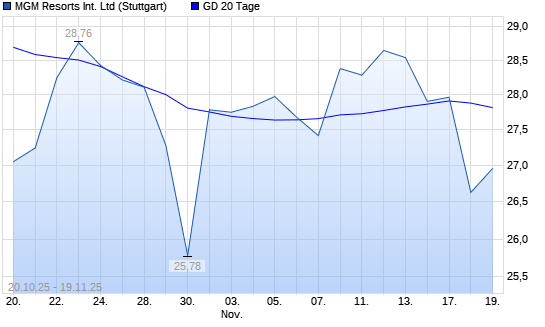 Mit dem Rücksetzer auf 26,63 EUR hat die MGM Resorts International-Aktie am 18.11.2025 die 20-Tage-Linie nach unten gekreuzt.