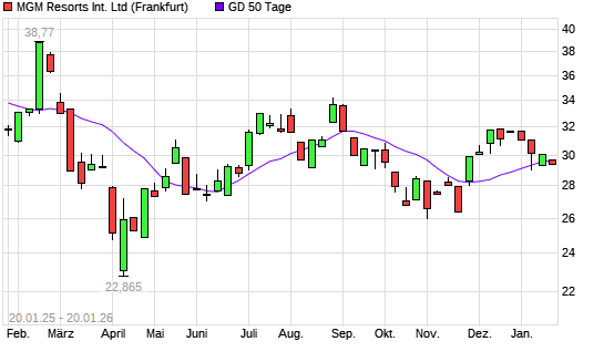 Mit dem Rücksetzer auf 29,66 EUR hat die MGM Resorts International-Aktie am 19.01.2026 die 50-Tage-Linie nach unten gekreuzt.