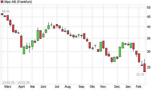 Mit dem Rücksetzer auf 25,00 EUR hat die MIPS Registered-Aktie (ISIN SE0009216278) am 12.02.2026 ein neues 12-Monats-Tief erreicht und damit den Kurs vom 06.02.2026 eingestellt.