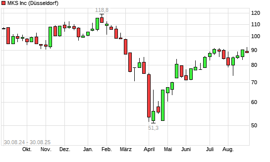 Mit dem Anstieg auf 91,54 EUR hat die MKS Instruments-Aktie (ISIN US55306N1046) am 29.08.2025 ein neues 6-Monats-Hoch erreicht und damit den Kurs vom 27.08.2025 eingestellt.
