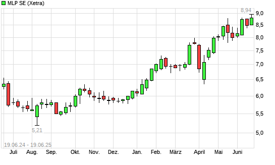 Mit dem Anstieg auf 8,89 EUR hat die MLP-Aktie (ISIN DE0006569908) am 18.06.2025 ein neues 10-Jahres-Hoch erreicht und damit den Kurs vom 17.06.2025 eingestellt.