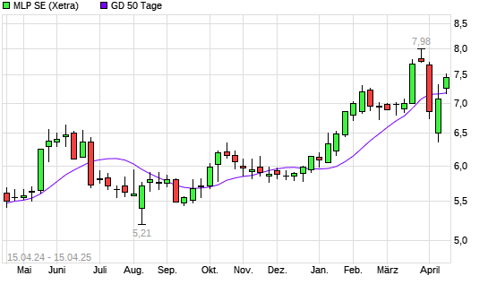 Mit dem Anstieg auf 7,33 EUR hat die MLP-Aktie am 14.04.2025 die 50-Tage-Linie nach oben gekreuzt.