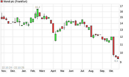 Mit dem Rücksetzer auf 9,45 EUR hat die MONDI-Aktie (ISIN GB00BMWC6P49) am 21.10.2025 ein neues 10-Jahres-Tief erreicht und damit den Kurs vom 17.10.2025 eingestellt.