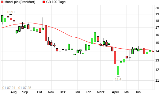 Mit dem Rücksetzer auf 14,00 EUR hat die MONDI-Aktie am 30.06.2025 die 100-Tage-Linie nach unten gekreuzt.