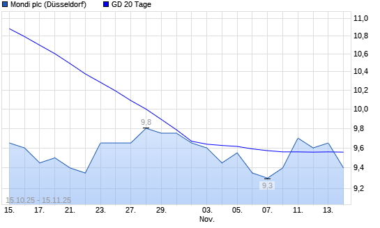 Mit dem Rücksetzer auf 9,60 EUR hat die MONDI-Aktie am 14.11.2025 die 20-Tage-Linie nach unten gekreuzt.