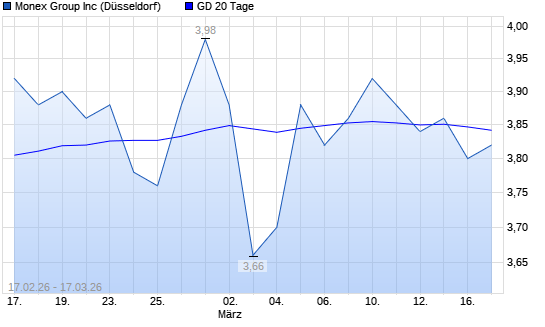 Mit dem Rücksetzer auf 3,86 EUR hat die MONEX GROUP-Aktie am 16.03.2026 die 20-Tage-Linie nach unten gekreuzt.