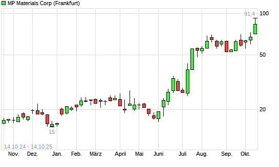 Mit dem Anstieg auf 83,00 EUR hat die MP Materials-Aktie (ISIN US5533681012) am 13.10.2025 ein neues All-Time-High erreicht und damit den Kurs vom 10.10.2025 eingestellt.