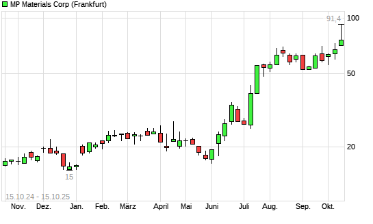 Mit dem Anstieg auf 83,60 EUR hat die MP Materials-Aktie (ISIN US5533681012) am 14.10.2025 ein neues All-Time-High erreicht und damit den Kurs vom 13.10.2025 eingestellt.