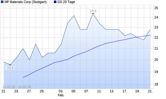 Mit dem Rücksetzer auf 21,80 EUR hat die MP Materials-Aktie am 20.02.2025 die 20-Tage-Linie nach unten gekreuzt.