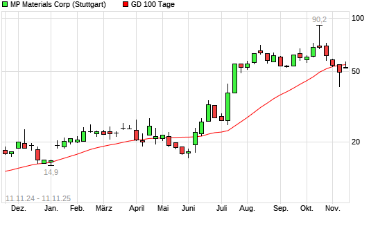 Mit dem Anstieg auf 56,40 EUR hat die MP Materials-Aktie am 10.11.2025 die 100-Tage-Linie nach oben gekreuzt.Die MP Materials-Aktie befindet sich seit dem 04.06.2025 im ...weiterlesen