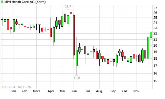 Mit dem Anstieg auf 20,70 EUR hat die MPH Health Care-Aktie (ISIN DE000A289V03) am 01.12.2025 ein neues 6-Monats-Hoch erreicht und damit den Kurs vom 27.11.2025 eingestellt.