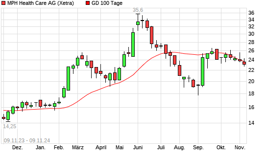 Mit dem Rücksetzer auf 22,80 EUR hat die MPH Health Care-Aktie am 08.11.2024 die 100-Tage-Linie nach unten gekreuzt.