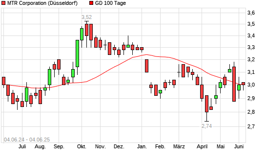 Mit dem Rücksetzer auf 3,02 EUR hat die MTR Corporation-Aktie am 03.06.2025 die 100-Tage-Linie nach unten gekreuzt.