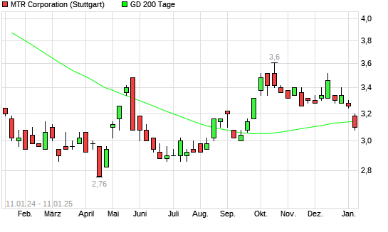 Mit dem Rücksetzer auf 3,12 EUR hat die MTR Corporation-Aktie am 10.01.2025 die 200-Tage-Linie nach unten gekreuzt.