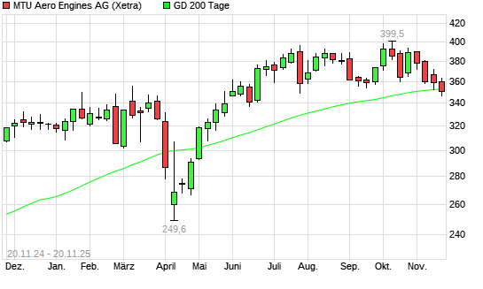 Mit dem Rücksetzer auf 351,40 EUR hat die MTU Aero Engines-Aktie am 19.11.2025 die 200-Tage-Linie nach unten gekreuzt.