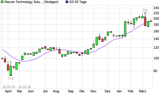 Mit dem Rücksetzer auf 190,00 EUR hat die Macom Technology-Aktie am 17.03.2026 die 50-Tage-Linie nach unten gekreuzt.