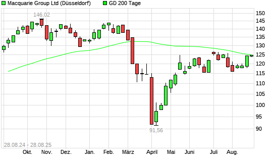 Mit dem Rücksetzer auf 125,08 EUR hat die Macquarie Group-Aktie am 27.08.2025 die 200-Tage-Linie nach unten gekreuzt.
