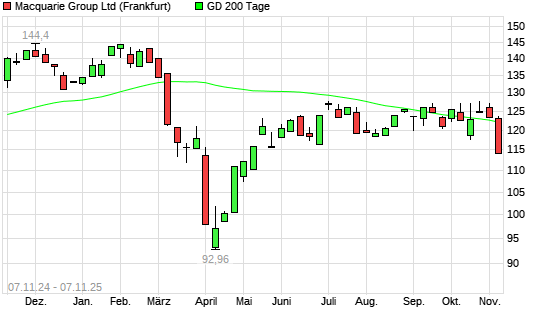 Mit dem Rücksetzer auf 121,42 EUR hat die Macquarie Group-Aktie am 06.11.2025 die 200-Tage-Linie nach unten gekreuzt.