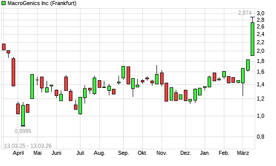 Mit dem Anstieg auf 2,87 EUR hat die MacroGenics-Aktie (ISIN US5560991094) am 12.03.2026 ein neues 12-Monats-Hoch erreicht und damit den Kurs vom 11.03.2026 eingestellt.