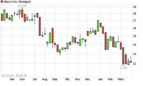 Mit dem Rücksetzer auf 11,75 EUR hat die Macy's-Aktie (ISIN US55616P1049) am 28.03.2025 ein neues 12-Monats-Tief erreicht und damit den Kurs vom 14.03.2025 eingestellt.
