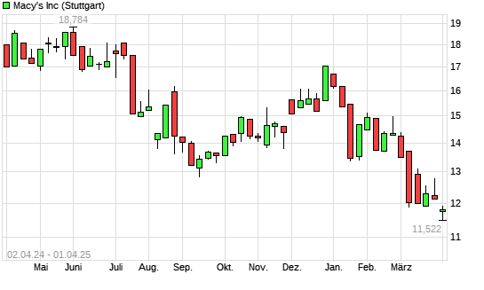 Mit dem Rücksetzer auf 11,64 EUR hat die Macy's-Aktie (ISIN US55616P1049) am 31.03.2025 ein neues 12-Monats-Tief erreicht und damit den Kurs vom 28.03.2025 eingestellt.