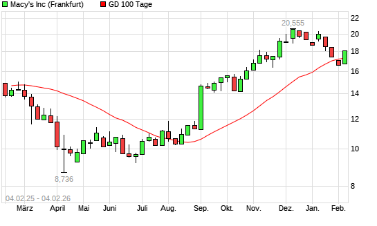 Mit dem Anstieg auf 17,84 EUR hat die Macy's-Aktie am 03.02.2026 die 100-Tage-Linie nach oben gekreuzt.
