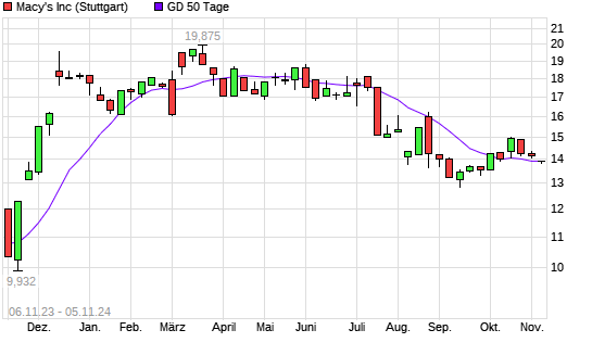 Mit dem Rücksetzer auf 13,89 EUR hat die Macy's-Aktie am 04.11.2024 die 50-Tage-Linie nach unten gekreuzt.