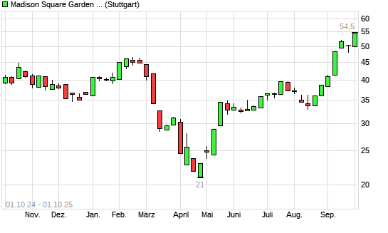 Mit dem Anstieg auf 53,00 EUR hat die Madison Square Garden Entertainment Corp.-Aktie (ISIN US55826T1025) am 30.09.2025 ein neues All-Time-High erreicht und damit den Kurs vom 29.09.2025 eingestellt.