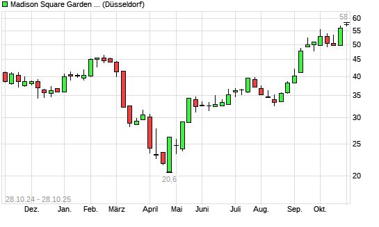 Mit dem Anstieg auf 58,00 EUR hat die Madison Square Garden Entertainment Corp.-Aktie (ISIN US55826T1025) am 27.10.2025 ein neues All-Time-High erreicht und damit den Kurs vom 24.10.2025 eingestellt.