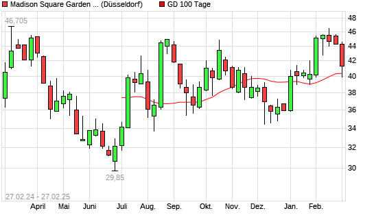 Mit dem Rücksetzer auf 40,24 EUR hat die Madison Square Garden Entertainment Corp.-Aktie am 26.02.2025 die 100-Tage-Linie nach unten gekreuzt.