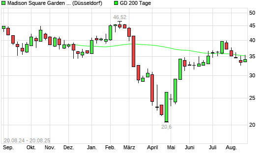 Mit dem Rücksetzer auf 34,80 EUR hat die Madison Square Garden Entertainment Corp.-Aktie am 19.08.2025 die 200-Tage-Linie nach unten gekreuzt.