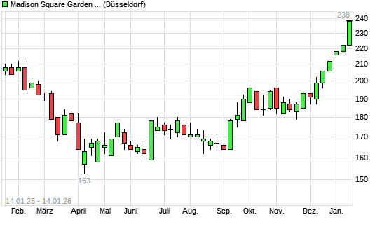 Mit dem Anstieg auf 230,00 EUR hat die Madison Square Garden Sports A-Aktie (ISIN US55825T1034) am 13.01.2026 ein neues All-Time-High erreicht und damit den Kurs vom 12.01.2026 eingestellt.