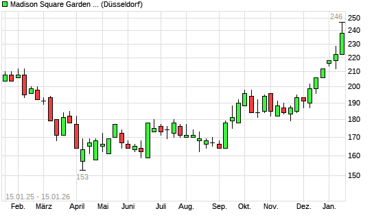 Mit dem Anstieg auf 234,00 EUR hat die Madison Square Garden Sports A-Aktie (ISIN US55825T1034) am 14.01.2026 ein neues All-Time-High erreicht und damit den Kurs vom 13.01.2026 eingestellt.
